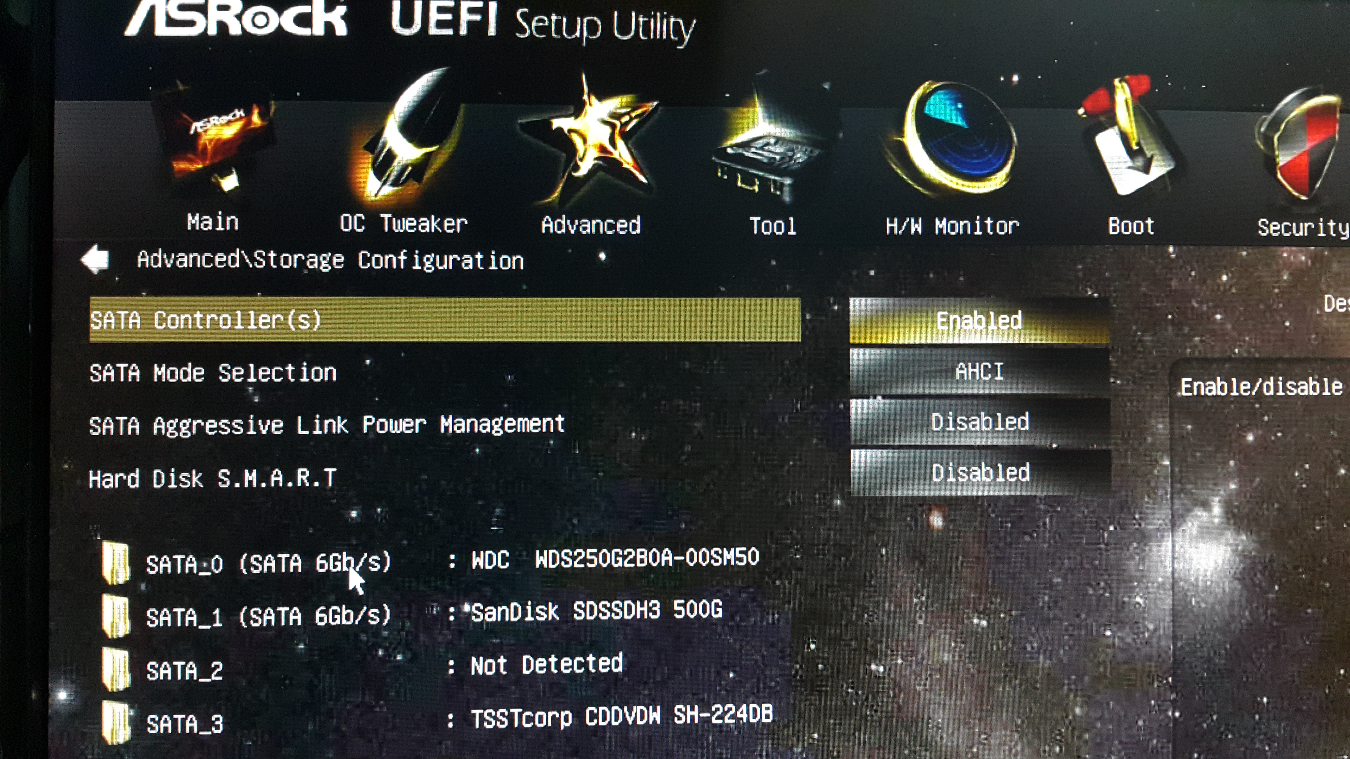 위에 보이는 것처럼 바이오스 셋업 화면에서는 2개의 SSD가 잘 나타나는 것을 볼 수 있다. SATA Controller(s)는 Enabled, SATA Mode Selection은 AHCI 설정 상태다.